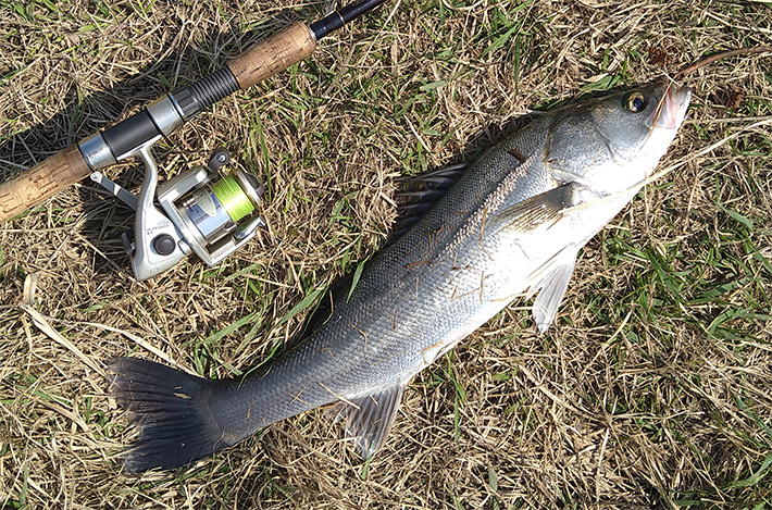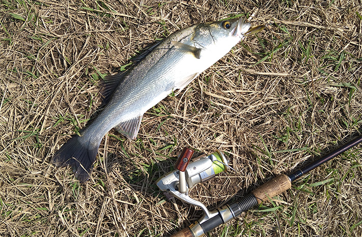 川底の地形や深さがわからないので、とりあえず表層を引けるルアーを選択。数投していると、ゴンっと根ががりのような感触。やってしまったか(泣)と思っていたら、ドラグがなりラインが出ていく。数十年ぶりにシーバスがヒットした。キスとかアジとかでは味わえない強烈な引き、あああ釣りしてるわ~。そんなこんなで無事、久々のシーバスをキャッチ。